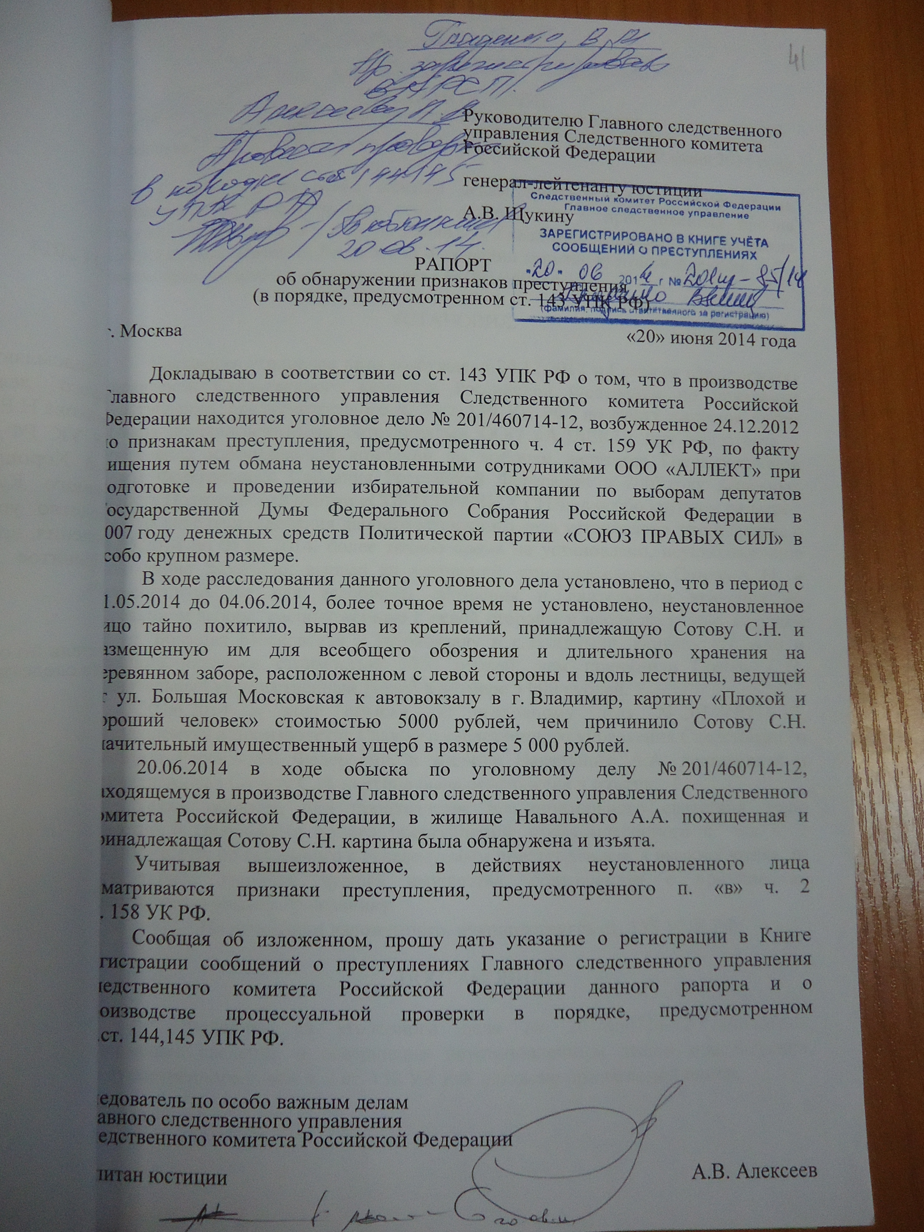 Написал рапорт о том, что в рамках расследования «дела СПС» обнаружена кража «картины» дворника Сотова, проведен обыск дома у Алексея Навального и «картина» изъята. Усмотрел в этой «краже картины» ст.158 ч.2 и и попросил зарегистировать рапорт в Книге сообщений о преступлении