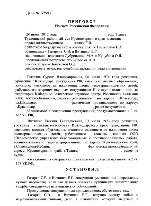 Вынесла обвинительный приговор Сурену Газаряну и Евгению Витишко, признав их виновными в повреждении забора («забор Ткачева») и приговорив к трем годам условно