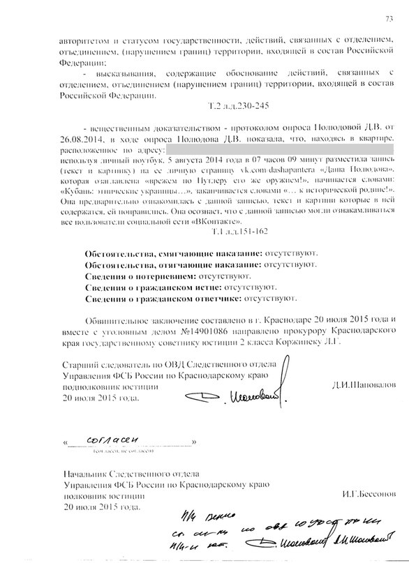 Согласовал обвинительное заключение по делу о призывах к эстремистской деятельности и призывах к сепаратизму (ст.280 ч.1 и ч.2, ст.280.1) в отношении активистки и соорганизатора «Марша за федерализацию Кубани» Дарьи Полюдовой