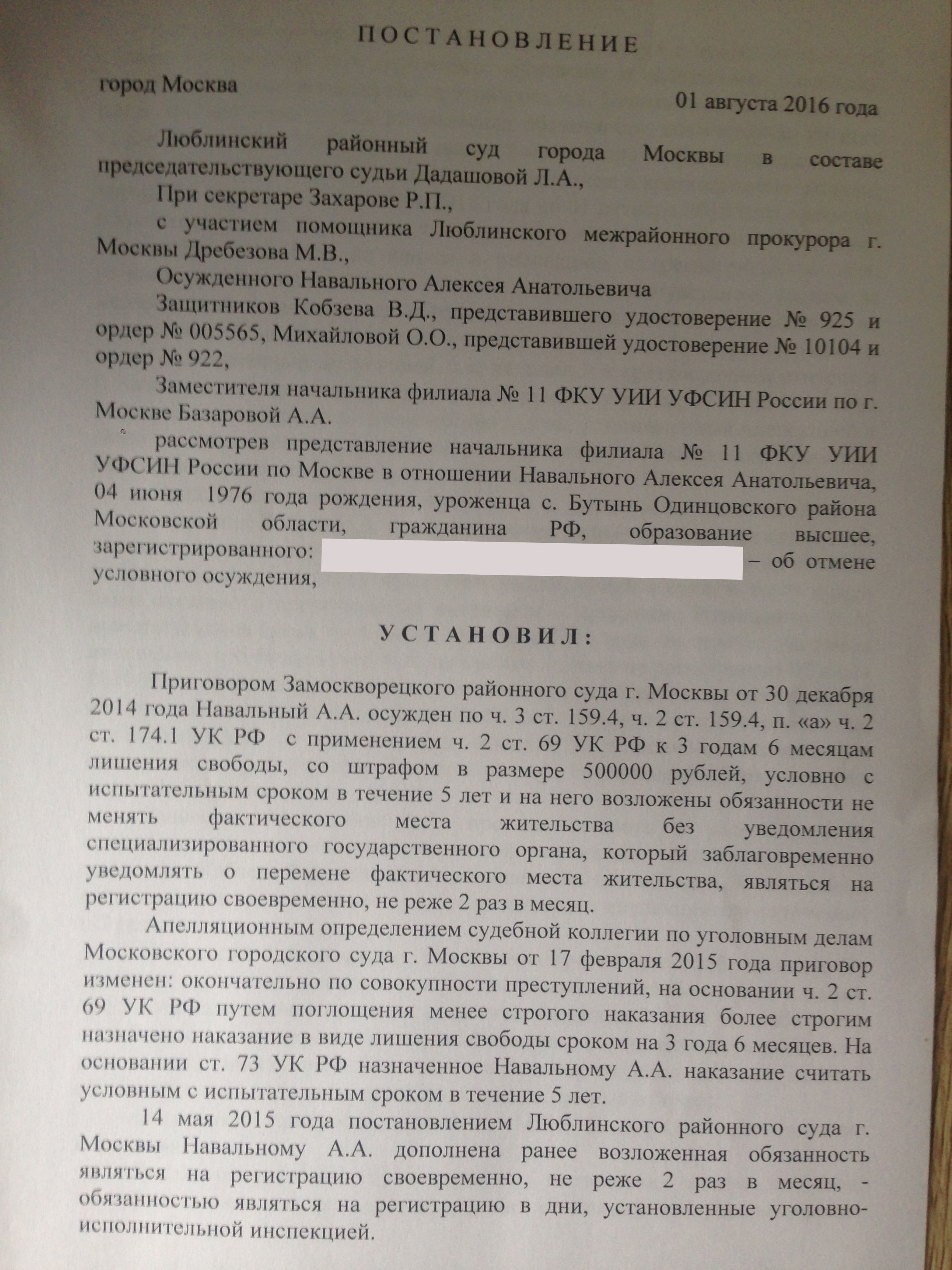 Поддержал ходатайство об изменении Алексею Навальному условного срока, полученного им по «делу „Ив Роше“», на реальное лишение свободы в колонии из-за того, что Навальный несколько раз не являлся в инспекцию в установленный день якобы без уважительной причины