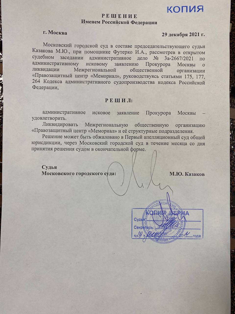 Вынес решение о ликвидации правозащитного центра «Мемориал».