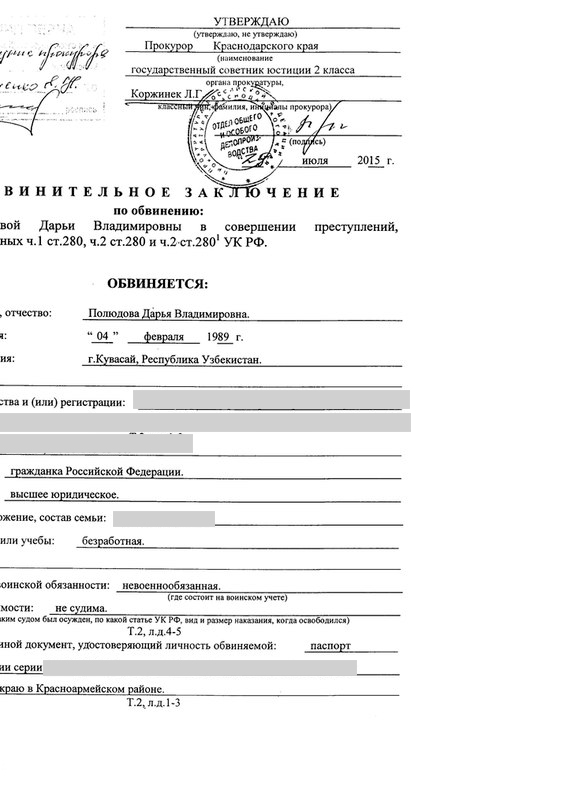 Утвердил и направил в суд обвинительное заключение по делу активистки Дарьи Полюдовой, которую обвиняли в призывах к эстремистской деятельности и призывах к сепаратизму (ст.280 ч.1 и ч.2, ст.280.1) за посты Вконтакте и текст плаката