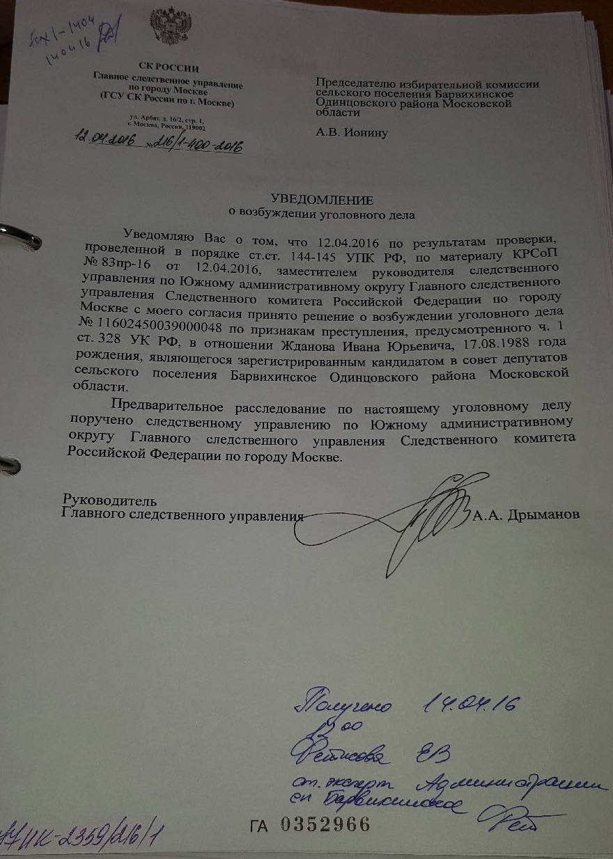 Возбудил уголовное дело против юриста Фонда борьбы с коррупцией Ивана Жданова по ст.328 ч.1 (уклонение от прохождения военной службы). При этом, по словам Жданова, до 25 лет он учился в аспирантуре и имел отсрочку, а затем не получал повесток и ни от кого не скрывался