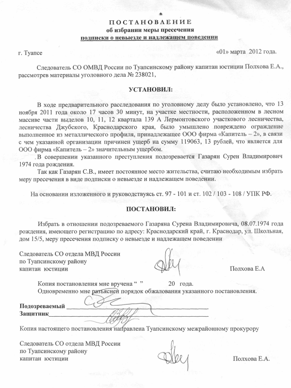 Постановила избрать меру пресечения в виде подписки о невыезде Сурену Газаряну, обвиняемому по делу о повреждении забора («забор Ткачева»)