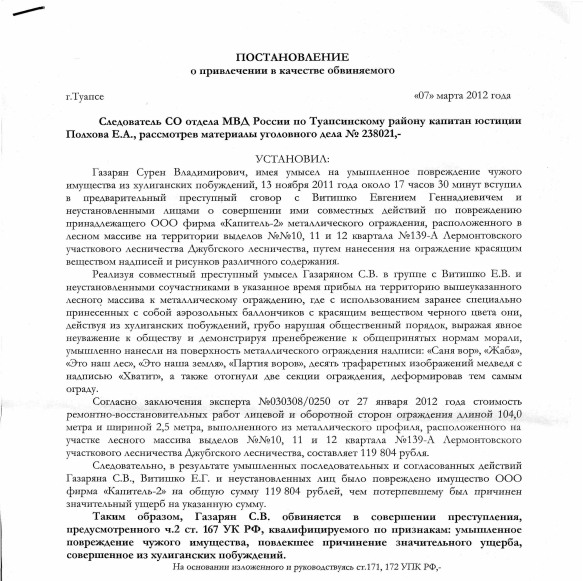 Постановила привлечь Сурена Газаряна в качестве обвиняемого по делу о повреждении забора («забор Ткачева»)
