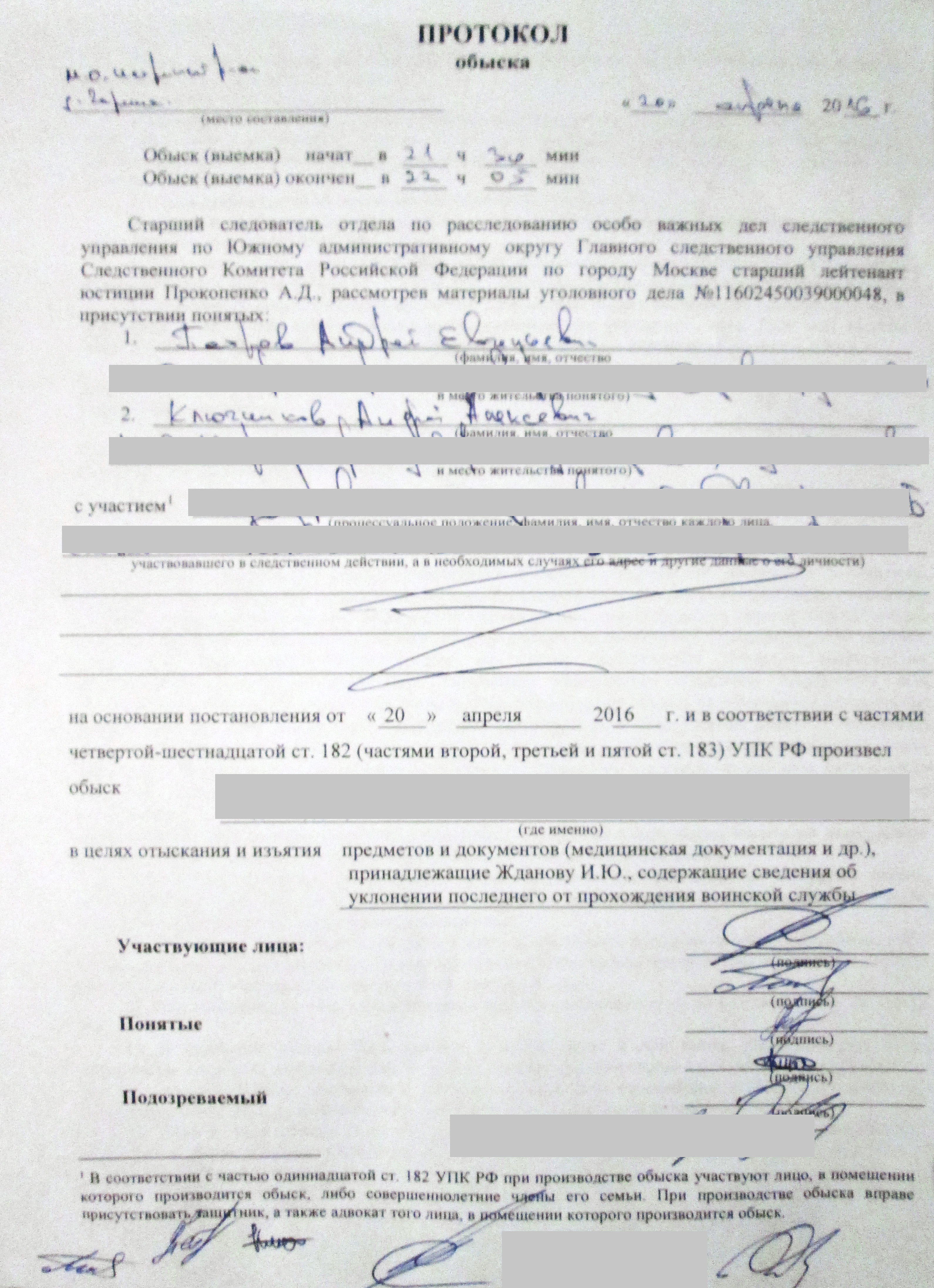 Провел обыск у руководителя юридического отдела Фонда борьбы с коррупцией Ивана Жданова по уголовному делу, возбужденному против него по ст.328 ч.1 (уклонение от прохождения военной службы)
